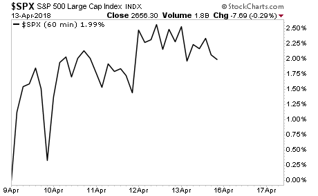 Stocks are up this morning. The media believes this has something to do with a "relief rally" regarding the fact that conflict in Syria didn't lead to WWIII over the weekend.