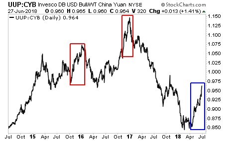 By the way, those last two devaluations (red boxes) resulted in the S&P 500 dropping 11% and 12% in less than one week.
